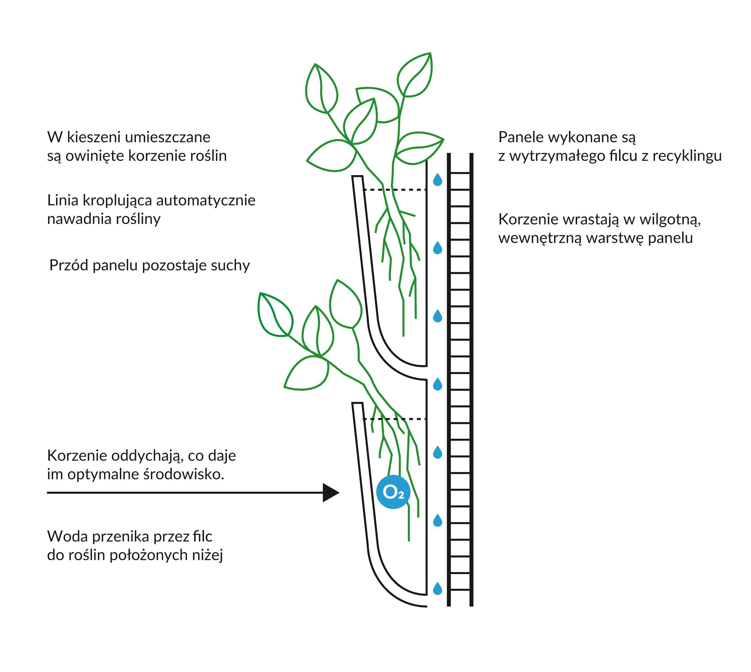 Gotowe kieszenie osadzone są na lekkiej, nieprzepuszczalnej płycie z tworzywa sztucznego. Woda zasilająca rośliny przesiąka jedynie przez tkaninę, dzięki czemu zielona ściana z mchu lub innych roślin nie niszczy podłóg i elementów wyposażenia. Płyta usztywnia panel oraz jest dodatkową izolacją. Stosując odpowiednią technikę montażu z paneli możemy tworzyć zarówno pionowe ogrody wewnętrzne i zewnętrzne.