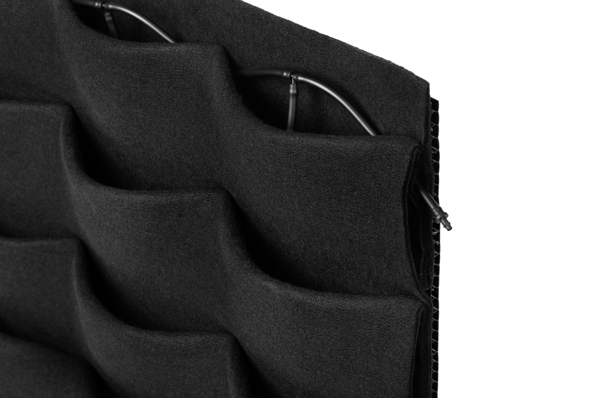 Płyta mocująca jest wykonana z bardzo wytrzymałego tworzywa sztucznego. Panel wyróżnia się niewielką wagą oraz wysoką wytrzymałością. Jest też odporny na wodę i chemikalia. Vertical Planter w całości powstają z materiałów, które pochodzą z recyklingu. Dzięki temu ściany z roślin są jeszcze bardziej naturalne i ekologiczne. Ponadto stabilny, miękki i prawie niezniszczalny materiał zapewnia optymalne środowisko dla wertykalnego ogrodu.