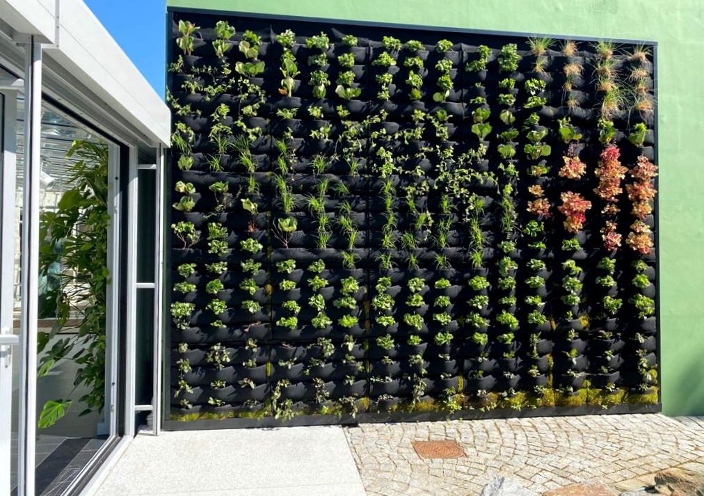 Ogród wertykalny zewnętrzny powstał jesienią poprzedniego roku. Z racji, że tegoroczna zima i wiosna, nie były zbyt przychylne dla roślin, to zielona ściana dopiero zaczyna rosnąć.
