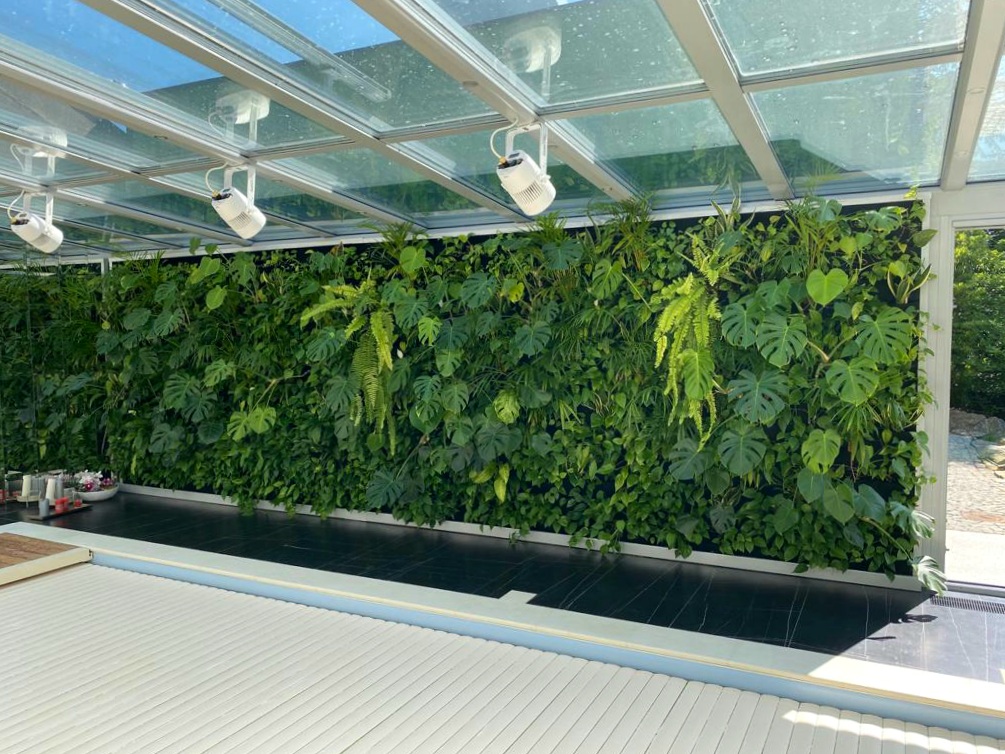 Zielona ściana na basenie była założona w 2019, więc zdążyła się już rozrosnąć i „zazielenić” wnętrze. Ogród wertykalny jest regularnie pielęgnowany, stąd też jego piękny wygląd. Zieleń na basenie na pewno działa kojąco i wypoczynek jest dużo przyjemniejszy.