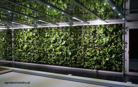 Kolejna realizacja, wykonana w domu prywatnym. Zielona ściana, dość dużych wymiarów, powstała u naszego Klienta przy basenie. Ogród wertykalny został dodatkowo optycznie powiększony dzięki lustrom. Teraz wygląda na dwa razy większy. Całość została obsadzona kilkoma gatunkami roślin. Standardowo, przeważa nasz ulubiony gatunek: Scindapsus, a jako urozmaicenie zostały dodane: Areka, Monstera, Skrzydłokwiat oraz Sansewieria. Dzięki takiemu połączeniu roślin, nasz ogród wertykalny szybko się rozrośnie (zasługa Scindapsusa) oraz uzyska ciekawych akcentów kolorystycznych (Skrzydłkwiat, Sansewieria) i nabierze ciekawej tekstury (Monstera).