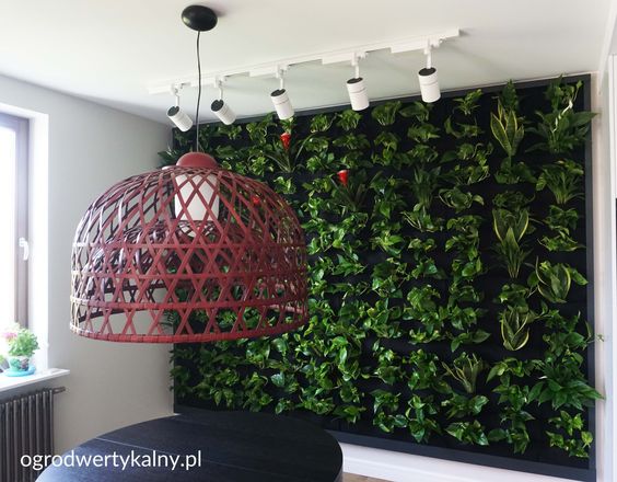 Ogród wertykalny w domu, to doskonały sposób na nadanie swojemu wnętrzu niepowtarzalnego charakteru. Każdy, kto kocha rośliny, będzie zadowolony z takiego rozwiązania. Rośliny we wnętrzach, nie tylko ładnie wyglądają, ale przede wszystkim dbają o powietrze. W prezentowanej przez nas realizacji, zastosowaliśmy: jako podstawę – Scindapsus, i wstawki: Sansewieria – roślina znakomicie czyszcząca powietrze oraz trochę koloru – Guzmania i Skrzydłokwiat.